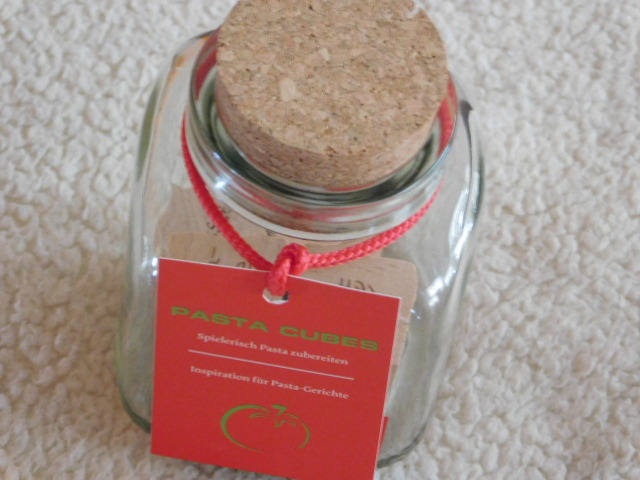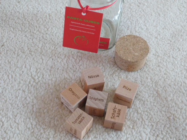 Mir wurde das PASTA CUBES sehr gut verpackt geliefert. Es ist nach der Umverpackung noch in einem sehr schön gestalteten Karton verpackt.Darin befindet sich ein doch recht schönes und bauchiges Glas, in dem sich 6 Holzwürfel befinden.Auf den Würfeln stehen dann jegliche Zutaten darauf. Verschlossen ist das Glas mit einem Korken. Also ganz ehrlich.....ich finde schon die Aufmachung alleine verleitet dieses zu verschenken.