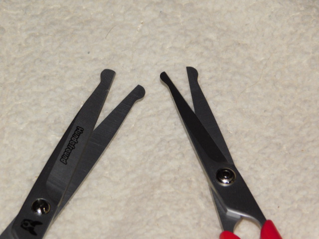 Die eine Schere ist 16,5 cm lang und hat eine abgerundete Spitze. So kann man den Vierbeiner bei der Fellpflege auf keinen Fall verletzen. Diese Schere hat ein Schneideblatt mit einer glatten Oberfläche. Sie wird benutzt, nach den Angaben des Herstellers, zum kürzen von Fell an Rumpf,Beinen und am Schwanz.